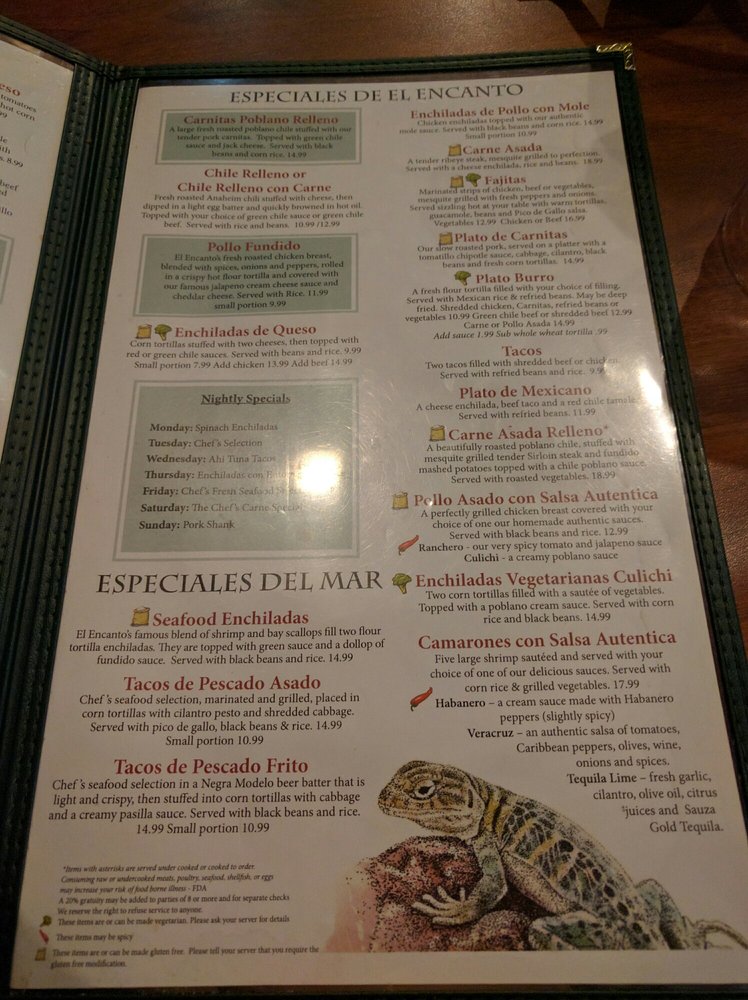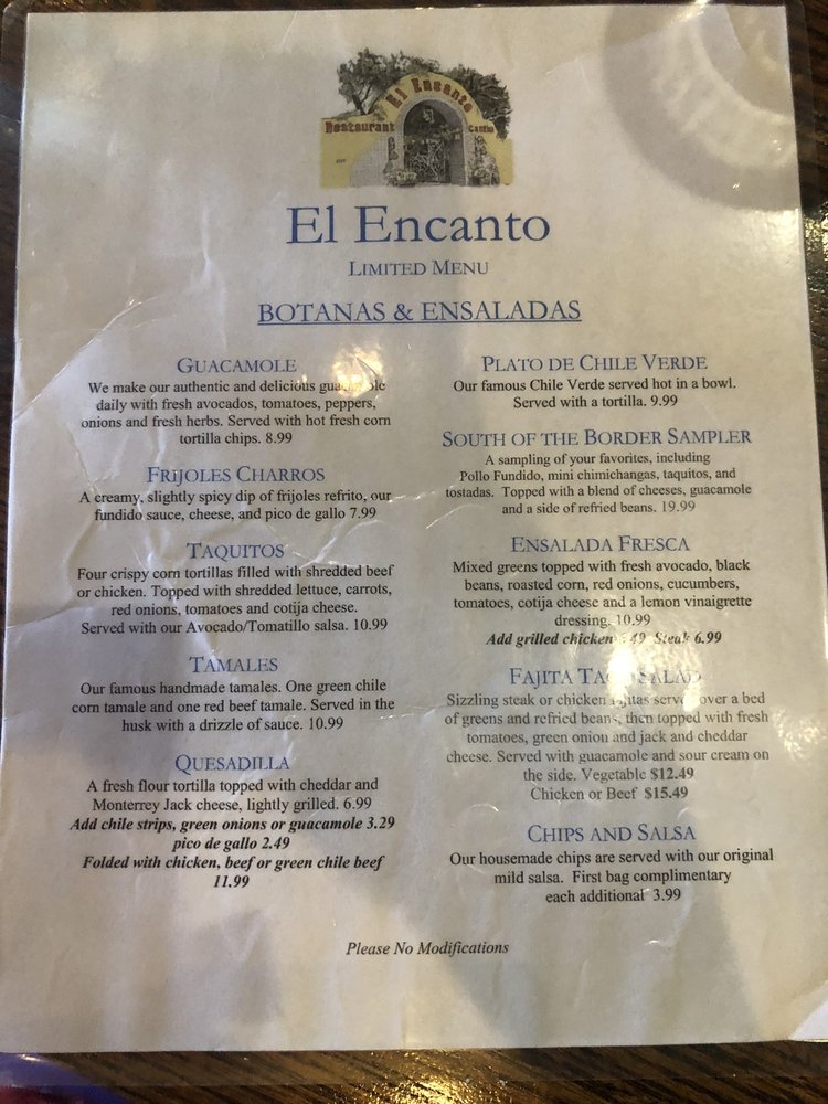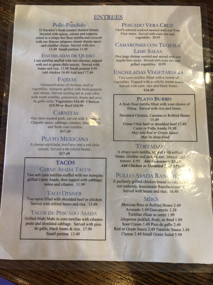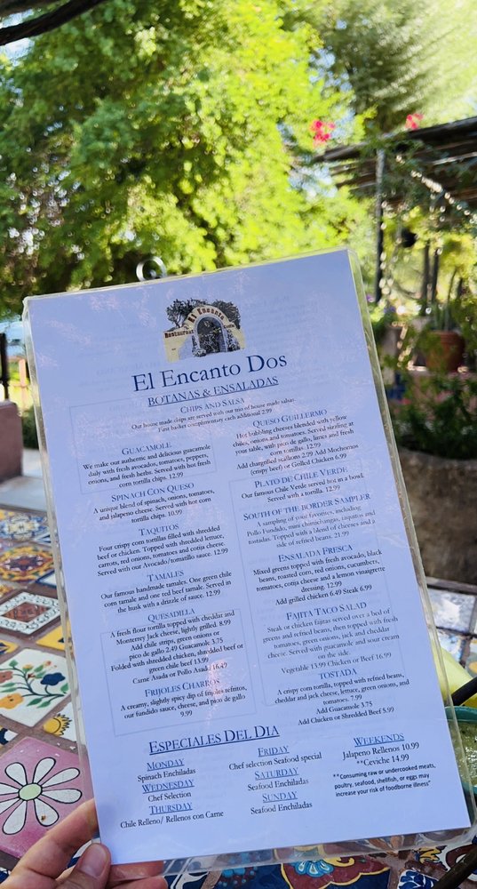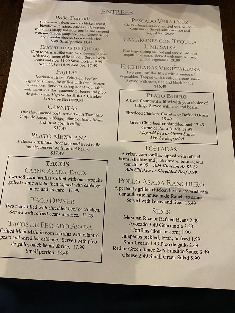 "Introducing the menu at El Encanto DOS, a Mexican restaurant located at 1112 E Carefree Hwy in Phoenix, AZ. This casual eatery offers a wide range of options for vegetarians and takes reservations for those looking to plan ahead. The restaurant also provides delivery and takeout services, making it convenient for diners on the go. With a full bar, happy hour specials, and outdoor seating available, El Encanto DOS is perfect for group gatherings or a casual dinner with friends. The menu features traditional Mexican dishes with a modern twist, and the friendly waitstaff ensures a pleasant dining experience. Whether you're looking for a quick lunch or a leisurely dinner, El Encanto DOS has something for everyone to enjoy."