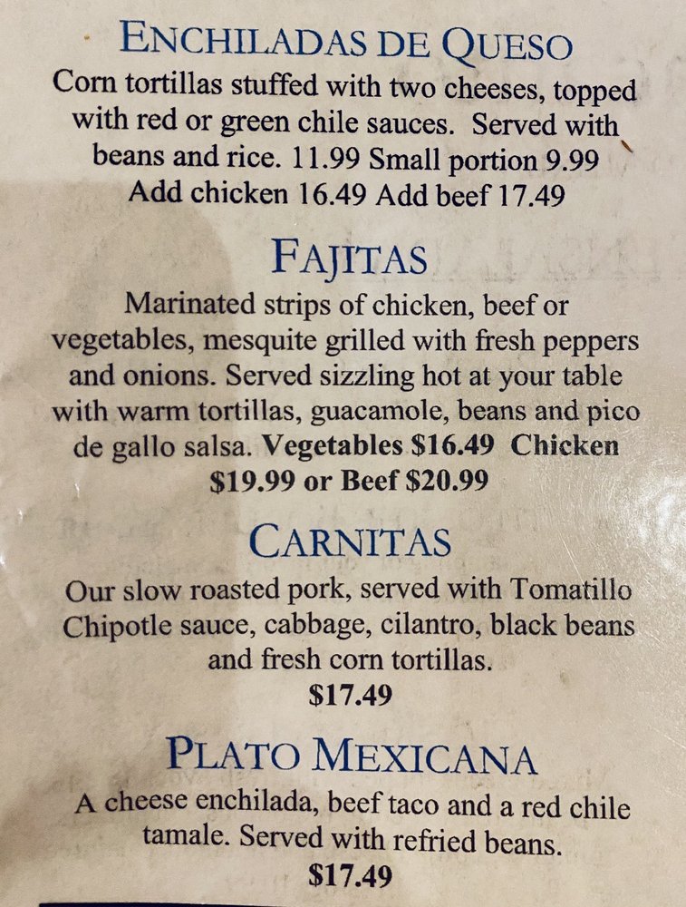 Corn tortillas stuffed with two cheeses and onions, then topped with red or green chile sauces. Served with beans and rice. . Small portion . Add chicken . Add beef .
