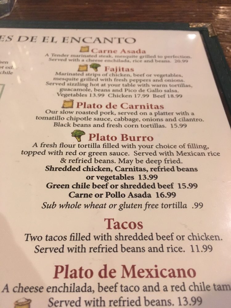 A fresh flour tortilla filled with your choice of filling, topped with red or green sauce. Served with Mexican rice & refried beans. May be deep fried. Shredded chicken, Carnitas, refried beans/cheese or vegetables . Green chile beef or shredded beef . Carne Asada or Pollo Asada . Sub whole wheat or gluten free tortilla . "BURRITO COMPUESTO"-Choice of filling stuffed with guacamole, sour cream, shredded cheese, lettuce and pico de gallo add . no substitutions